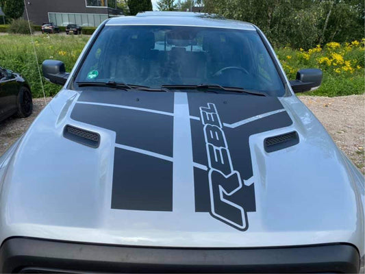 Matte Black - Custom Rebel Text & Stripes 2009-2019 Dodge RAM SRT 1500 Performance Full Sport Hood Decal